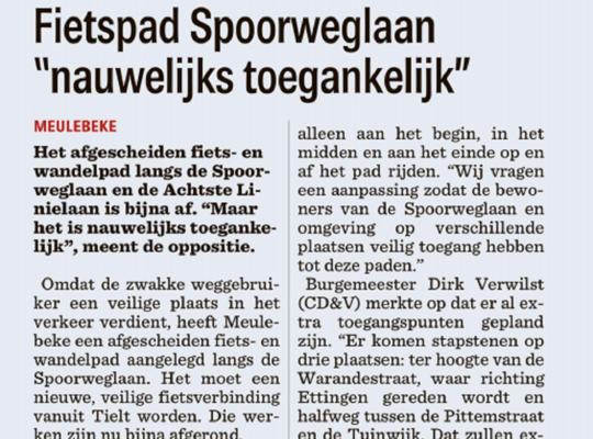 “Maar het 'afgescheiden' karakter van de zone is een beetje te letterlijk genomen”, merkte raadslid Rik Vergote (N-VA) op tijdens de jongste gemeenteraad. Vooral fietsers kunnen alleen aan het begin, in het midden en aan het einde op en af het pad rijden. “Wij vragen een aanpassing zodat de bewoners van de Spoorweglaan en omgeving op verschillende plaatsen veilig toegang hebben tot deze paden.”